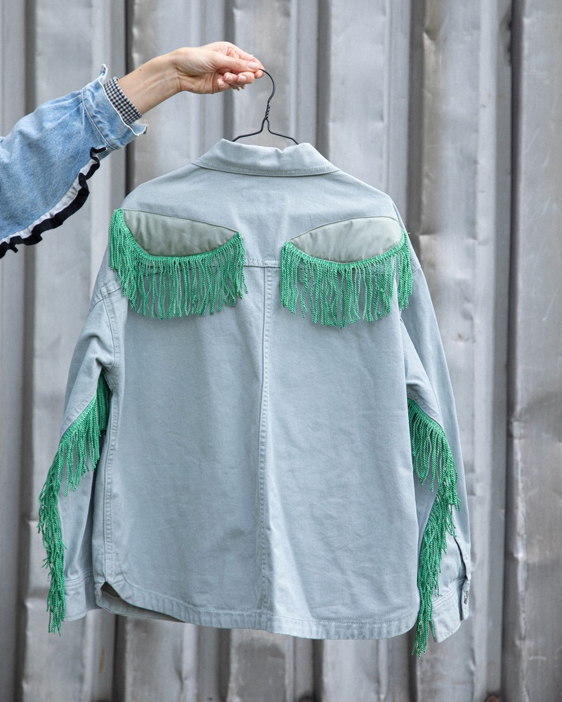 Nášivky sú z ramenných vypchávok, čo ostali po upcyklácii iného kúsku. Strapce sú z galantérie tiež z druhej ruky.