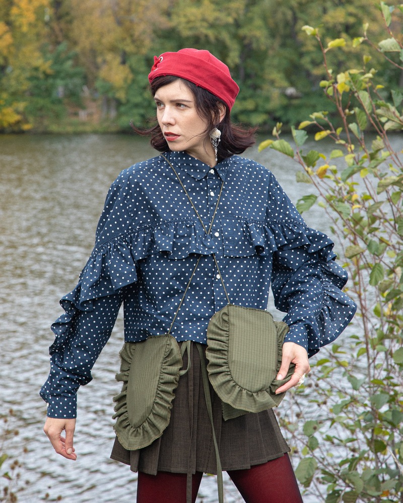 Veľký volán odkazujúci na jej predchodcu - viktoriánske vrecká nosené na šatách - je jej jedinou ozdobou.